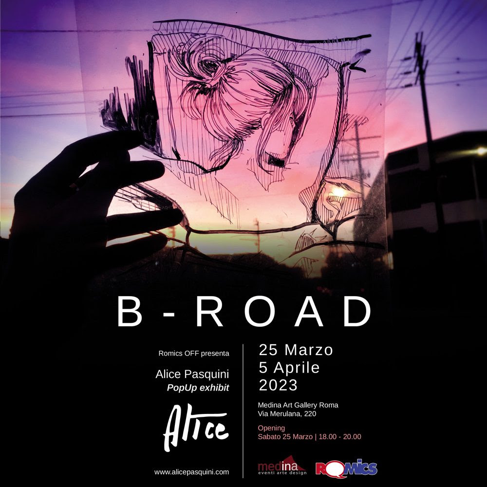 Dal 25 marzo al 5 aprile 2023 Medina Art Gallery presenta il PopUp exhibit di Alice Pasquini B-ROAD in collaborazione con Romics, Festival Internazionale del Fumetto, Animazione, Cinema e Games.