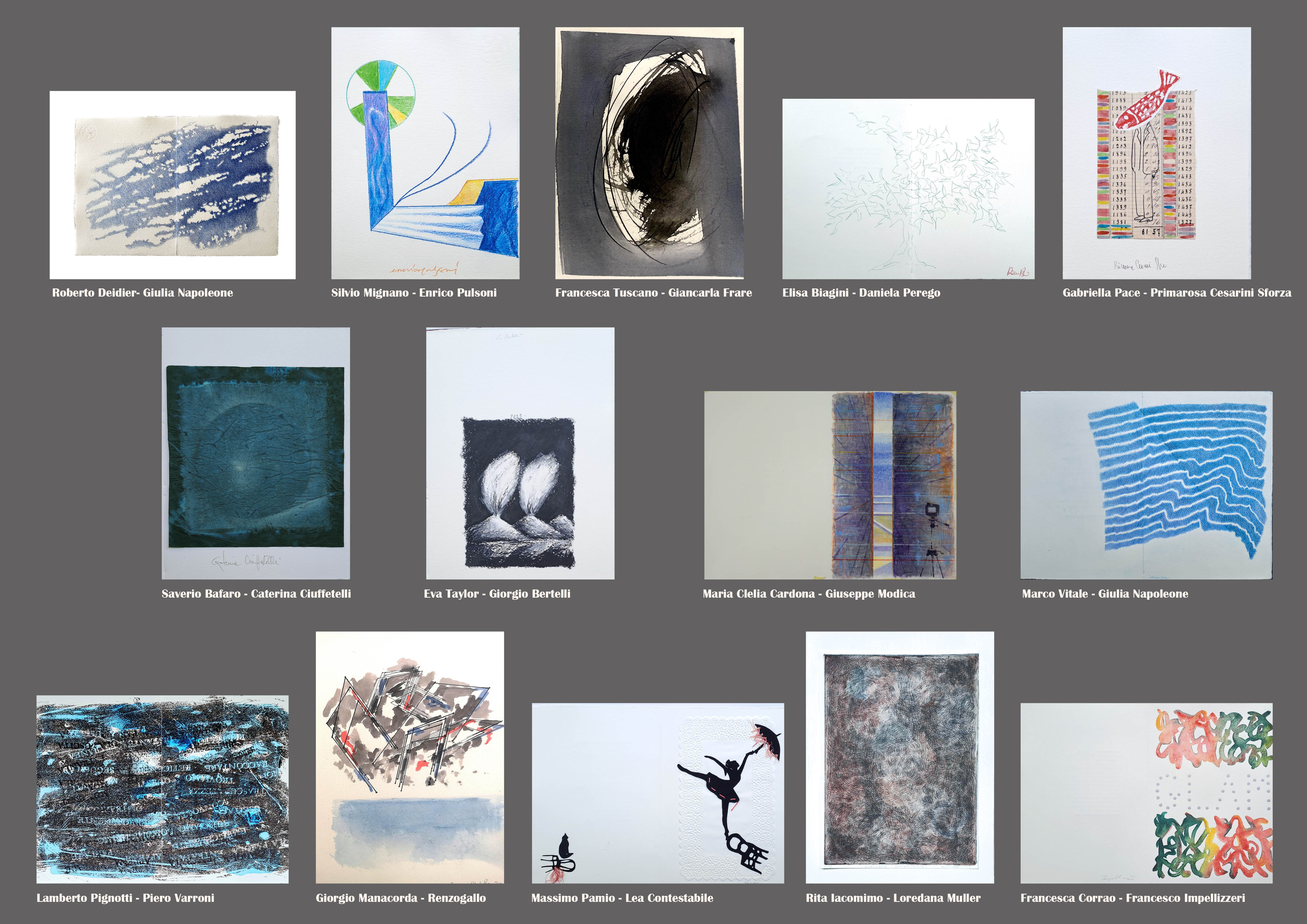I quattordici artisti chiamati ad operare in ogni esemplare sono: Giorgio Bertelli, Lea Contestabile, Caterina Ciuffetelli, Giancarla Frare, Francesco Impellizzeri, Giuseppe Modica, Loredana Muller, Giulia Napoleoni, Daniela Perego, Enrico Pulsoni, Renzogallo, Primarosa Cesarini Sforza, Piero Varroni. Accompagnano ogni esemplare d’artista quattordici poesie scritte dai seguenti poeti: Saverio Bafaro, Elisa Biagini, Maria Clelia Cardona, Francesca Corrao, Roberto Deidier, Rita Iacomimo, Giorgio Manacorda, Silvio Mignano, Gabriella Pace, Massimo Pamio, Lamberto Pignotti, Francesca Tuscano, Eva Taylor, Marco Vitale.