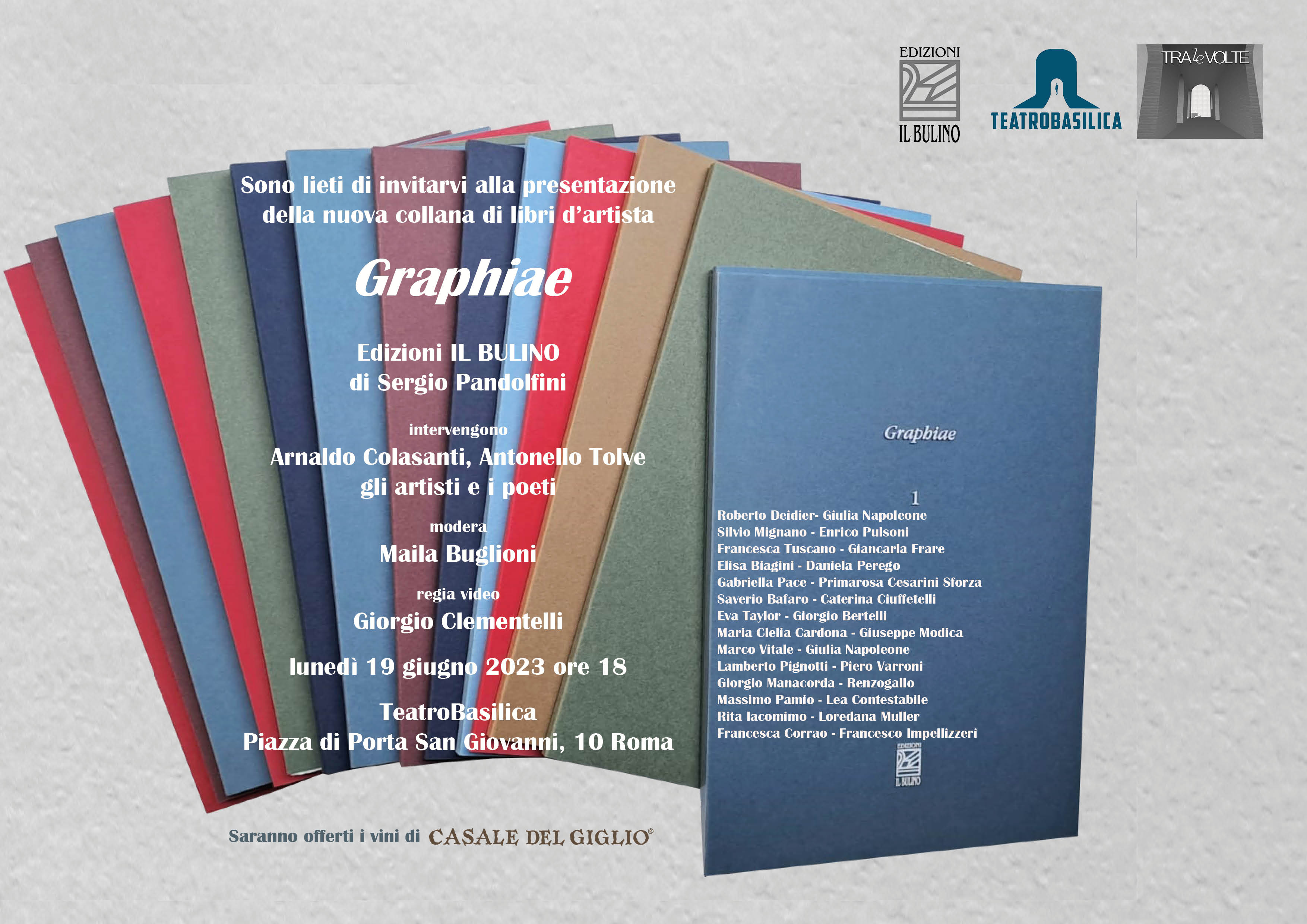 La storica stamperia d’arte Il Bulino di Sergio Pandolfini è lieta di invitarvi lunedì 19 giugno 2023 alle ore 18 alla presentazione della nuova collana di libri d’arte “Graphiae”, in collaborazione con l’Associazione culturale TRAleVOLTE, presso il Teatro Basilica di Roma.