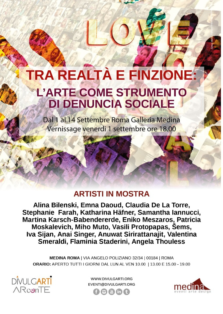 Dal 1 al 14 Settembre 2023 Medina Art Gallery presenta “Tra realtà e finzione: l’Arte come strumento di denuncia sociale”, la mostra d’Arte Contemporanea internazionale nella galleria di Via Angelo Poliziano 32-34 a Roma, curata e diretta da Loredana Trestin con la collaborazione di Maria Cristina Bianchi, l’ideazione dell’Associazione ARconTE e l’organizzazione di Divulgarti con responsabilità di Valentina Maggiolo. Staff: Ludovica Dagna, Giulia Lanza, Anna Poddine, Chiara Quintavalla, Beatrice Sorlino.