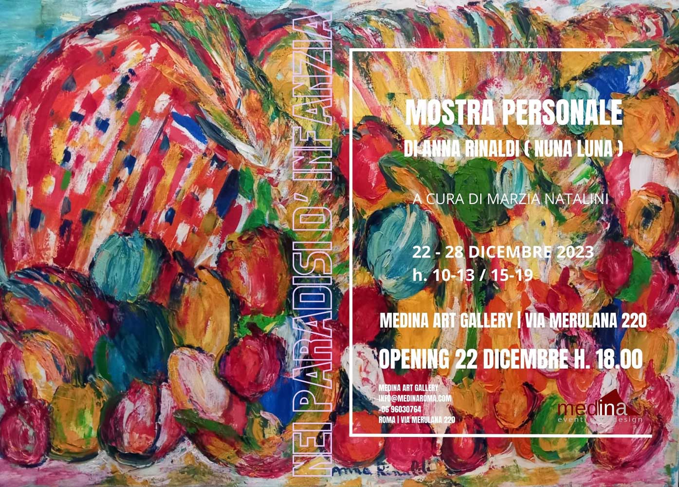 Dal 22 al 28 dicembre 2023, Medina Art Gallery presenta la mostra personale di Anna Rinaldi (Nuna Luna) “Nei paradisi d’infanzia” a cura di Marzia Natalini. A Roma nella gallery di Via Merulana 220.
