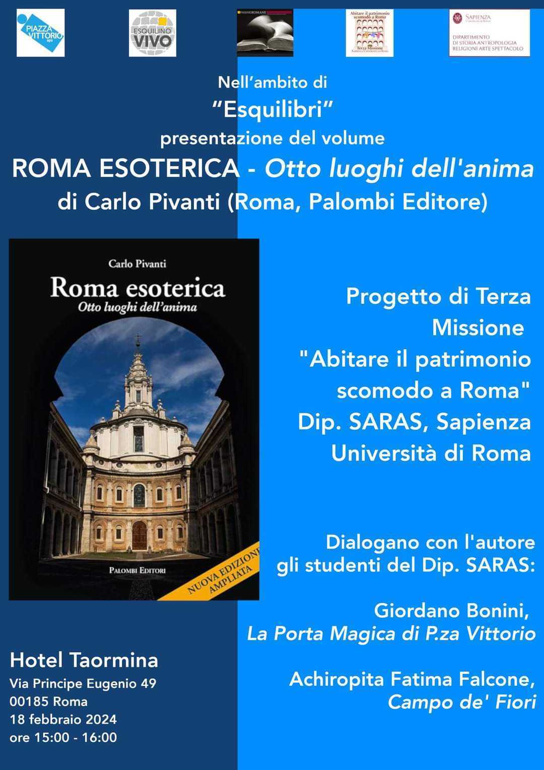 - dalle ore 15:00 alle ore 16:00 presentazione della nuova edizione del libro Roma Esoterica di Carlo Pivanti, commentato dagli studenti di Antropologia del Dipartimento SARAS della Sapienza di Roma;