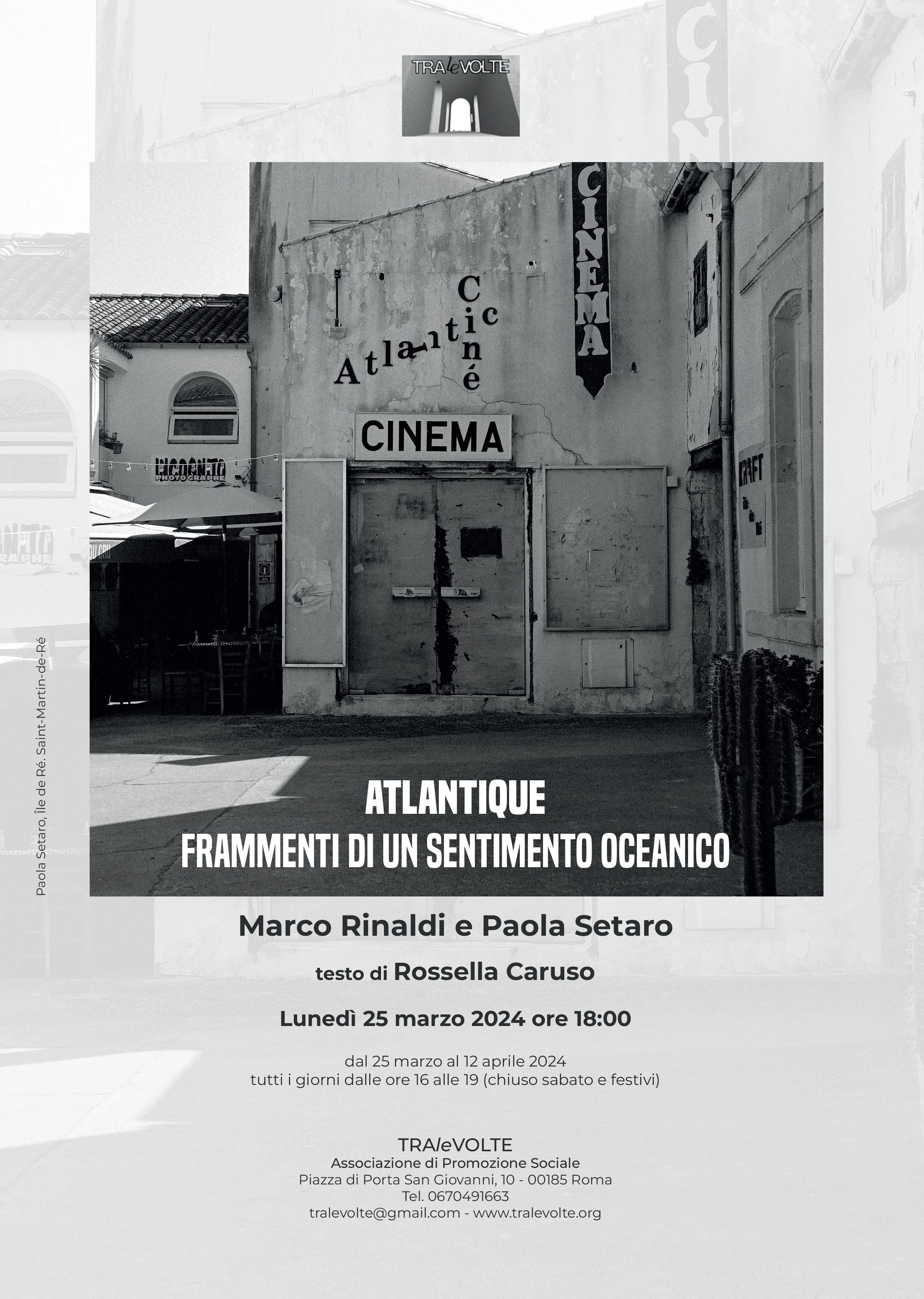 Lunedì 25 marzo, alle ore 18:00, si inaugura presso l’Associazione TRAleVOLTE la mostra fotografica di Marco Rinaldi e Paola Setaro Atlantique. Frammenti di un sentimento oceanico, con testo di presentazione di Rossella Caruso.