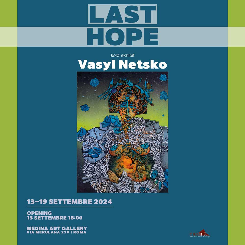 "Last Hope" mette in esposizione nella gallery di Via Merulana 220 a Roma, le ultime opere di Vasyl Netsko, che sui passi dei grandi maestri della Storia dell'Arte, sviluppa ed elabora interpretazioni contemporanee ed introspettive. Elemento-chiave per accedere alla dimensione dell'artista è la trasformazione dei motivi attraverso emozioni ed esperienze personali, per incoraggiare l’ascolto delle storie: innocenza e fascino rivelano il complicato rapporto degli amanti, i giochi di guerra dell’infanzia si mescolano alla scandalosa “Frenzy of Elation”.