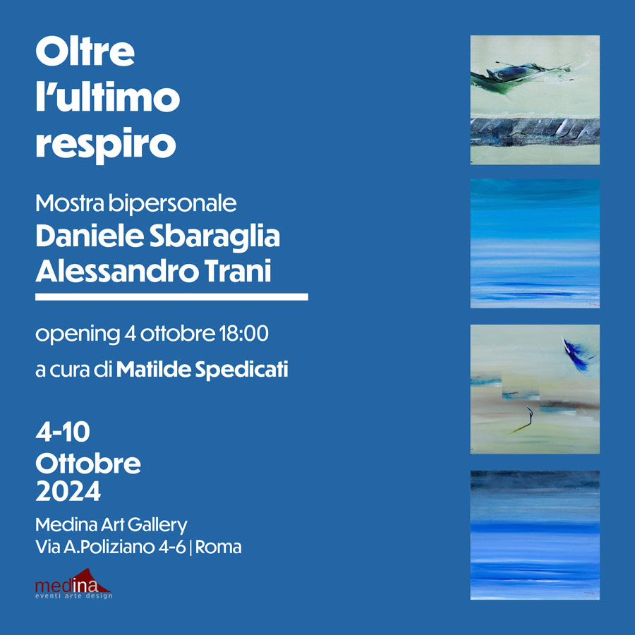 Fino al 10 ottobre 2024 Medina Art Gallery presenta la mostra bipersonale OLTRE L’ULTIMO RESPIRO di Daniele Sbaraglia e Alessandro Trani, a cura di Matilde Spedicati nella gallery di Via Angelo Poliziano 4-6 a Roma.