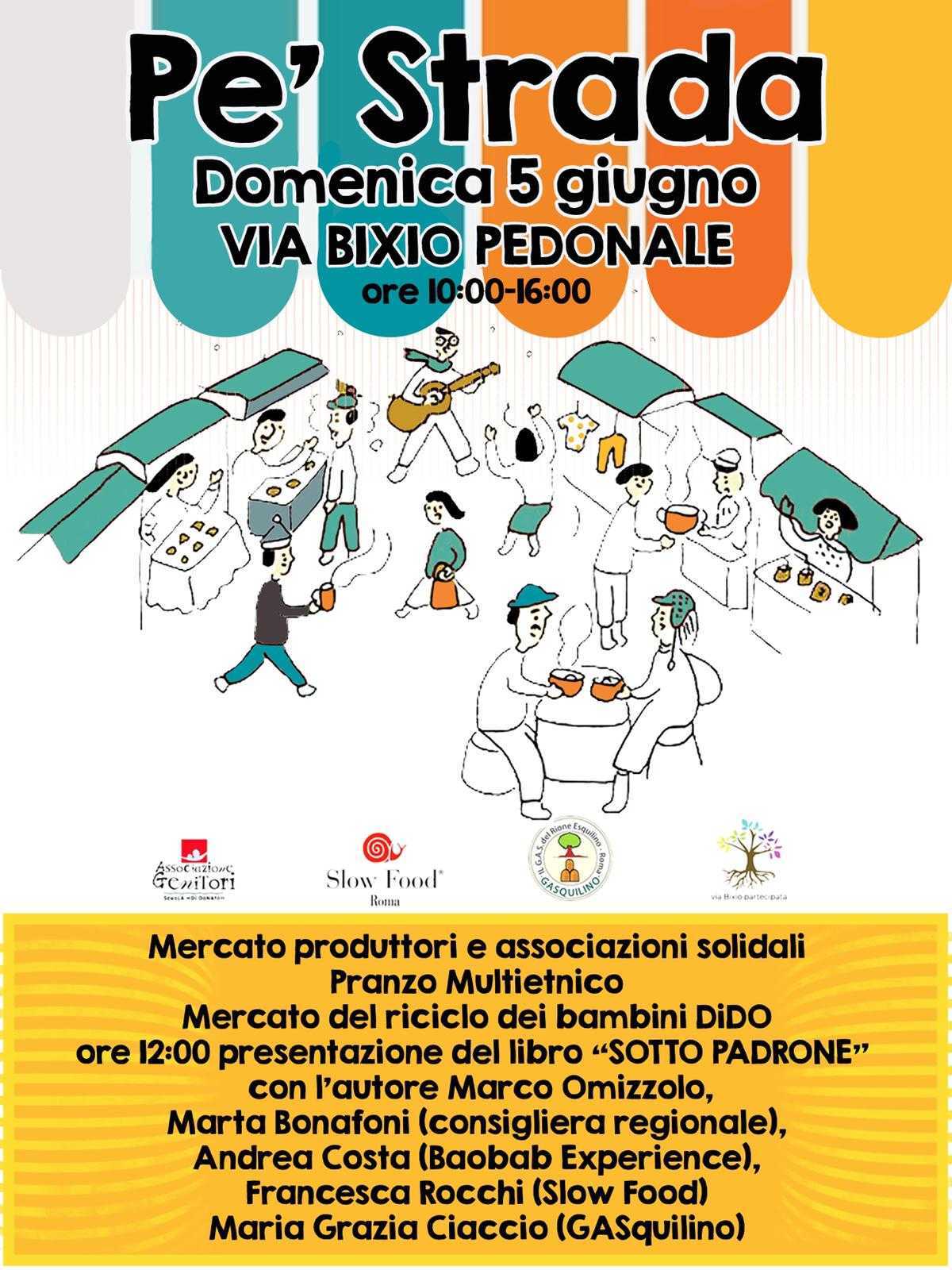 La manifestazione Pe’Strada è volta ad aiutare la pedonalizzazione della strada scolastica di Via Bixio, nel quartiere Esquilino.