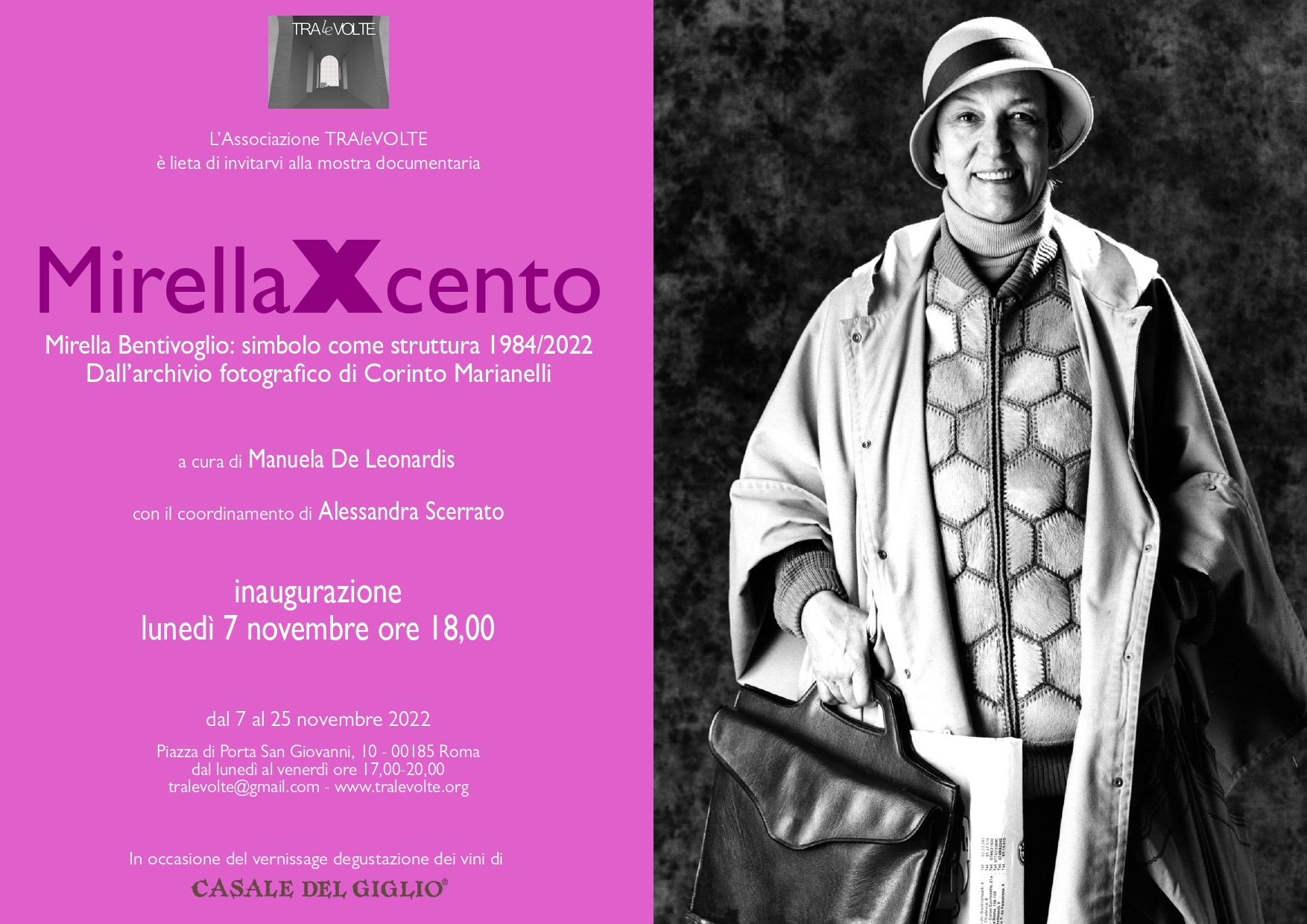 L’Associazione Culturale TRAleVOLTE è lieta di presentare la mostra MirellaXcento - Mirella Bentivoglio: simbolo come struttura 1984/2022. Dall’archivio fotografico di Corinto Marianelli, a cura di Manuela De Leonardis, concepita come tributo all’artista, critica d’arte e poetessa visiva in occasione del centenario della nascita.