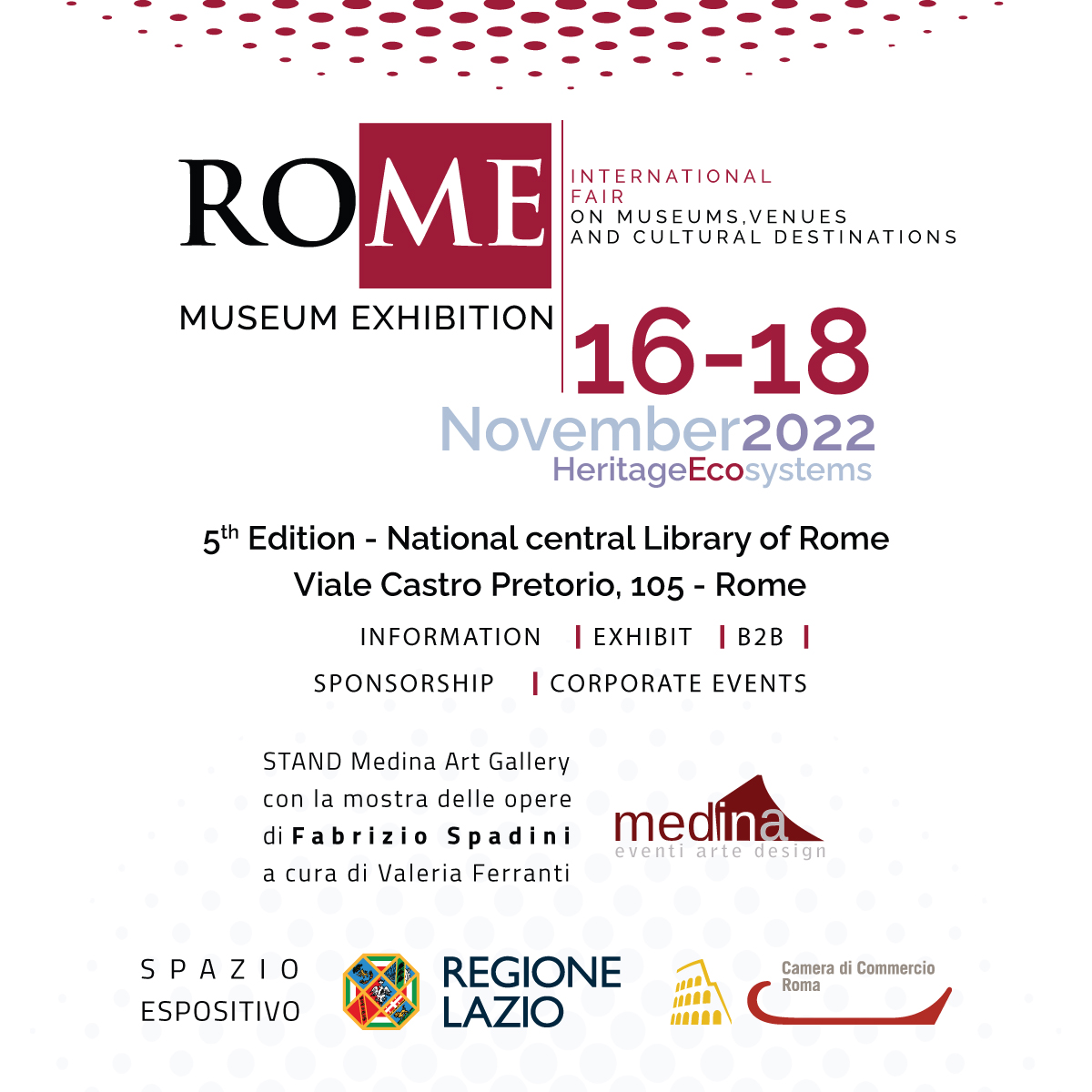 Dal 16 al 18 novembre 2022 Medina Art Gallery partecipa alla 5a Edizione di Ro.Me Museum Exhibition con la mostra delle opere dell’artista contemporaneo Fabrizio Spadini a cura di Valeria Ferranti. Con uno stand all’interno dello Spazio Espositivo Regione Lazio e Camera di Commercio di Roma.