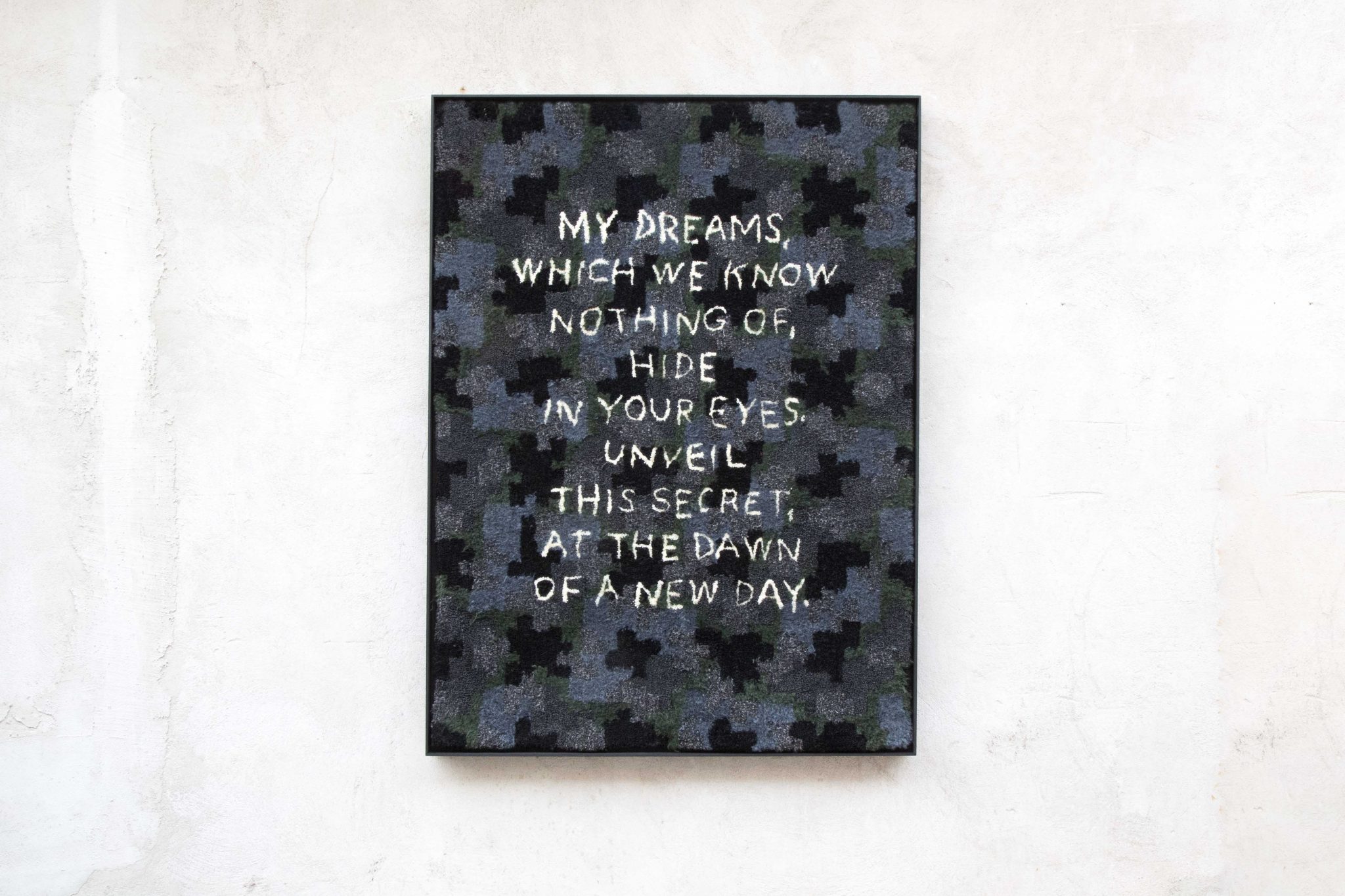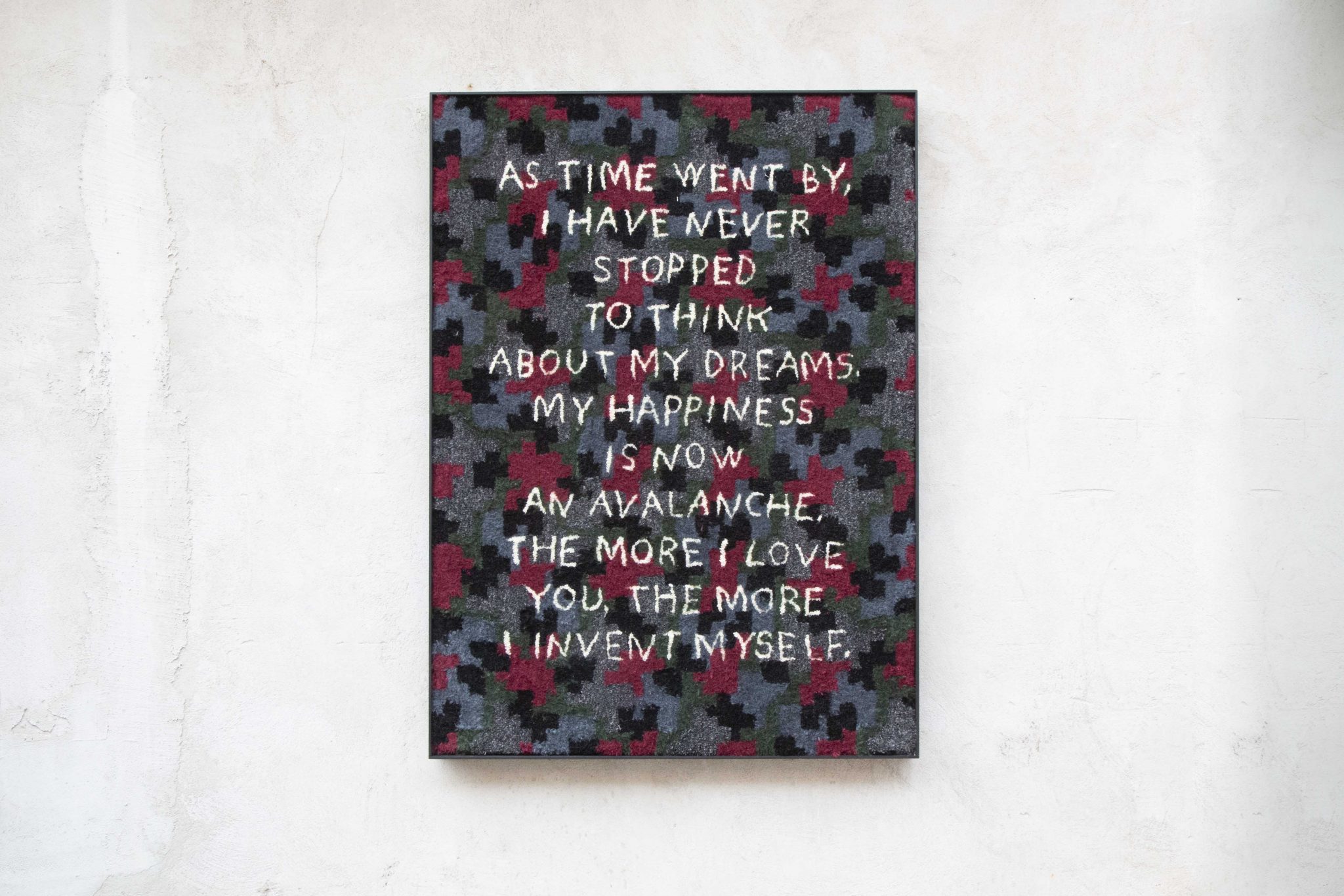 La mostra è ideata ad hoc per gli spazi del museo e presenta un percorso che si apre con un’opera di grandi dimensioni posta nell’atrio principale del sito. Sulla superficie tattile dell’opera è tessuto un testo generato da I.L.Y., Intelligenza Artificiale istruita da Numero Cromatico a produrre poesie d’amore. All’interno degli ambienti sotterranei della Crypta Balbi sono disposte, nascoste e inserite ulteriori opere di diverse dimensioni con contenuti testuali che, come entità autonome, si rivolgono direttamente all’osservatore.