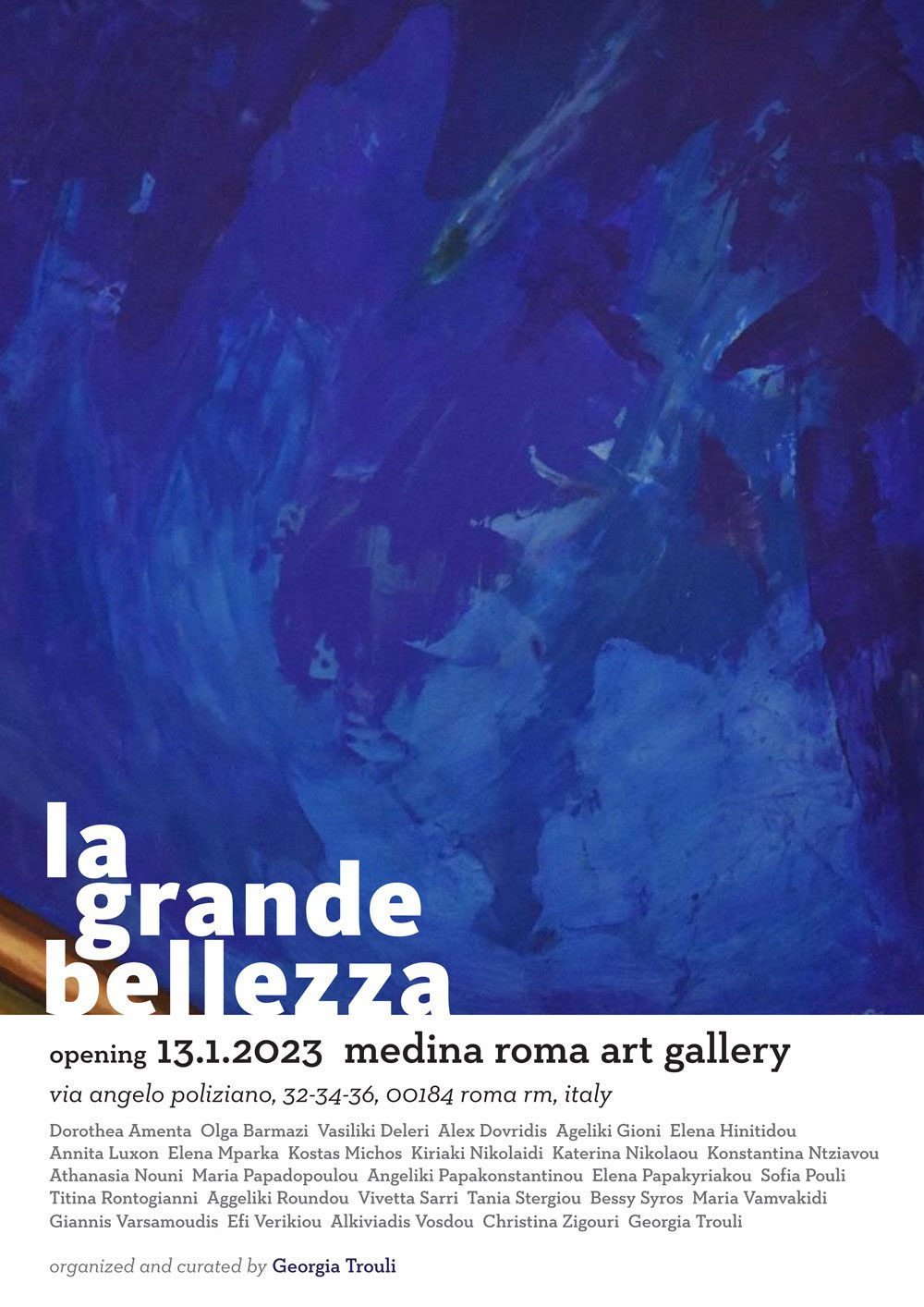 Dal 13 al 19 gennaio 2023 Medina Art Gallery presenta ''La grande Bellezza", mostra di opere ispirate alle grandi pellicole del cinema italiano in generale, con un tributo particolare e diretto al film di Paolo Sorrentino a 10 anni dalla sua uscita al pubblico. Un tempo in cui l’analisi può cominciare a considerarsi matura.