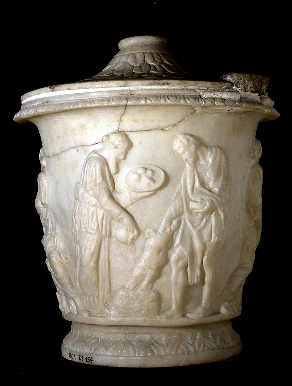 Il fregio figurato, eccezionale per un vaso cinerario, si articola in tre scene successive da sinistra verso destra. Nella prima, un giovane Eracle e un sacerdote barbato, appaiono ...