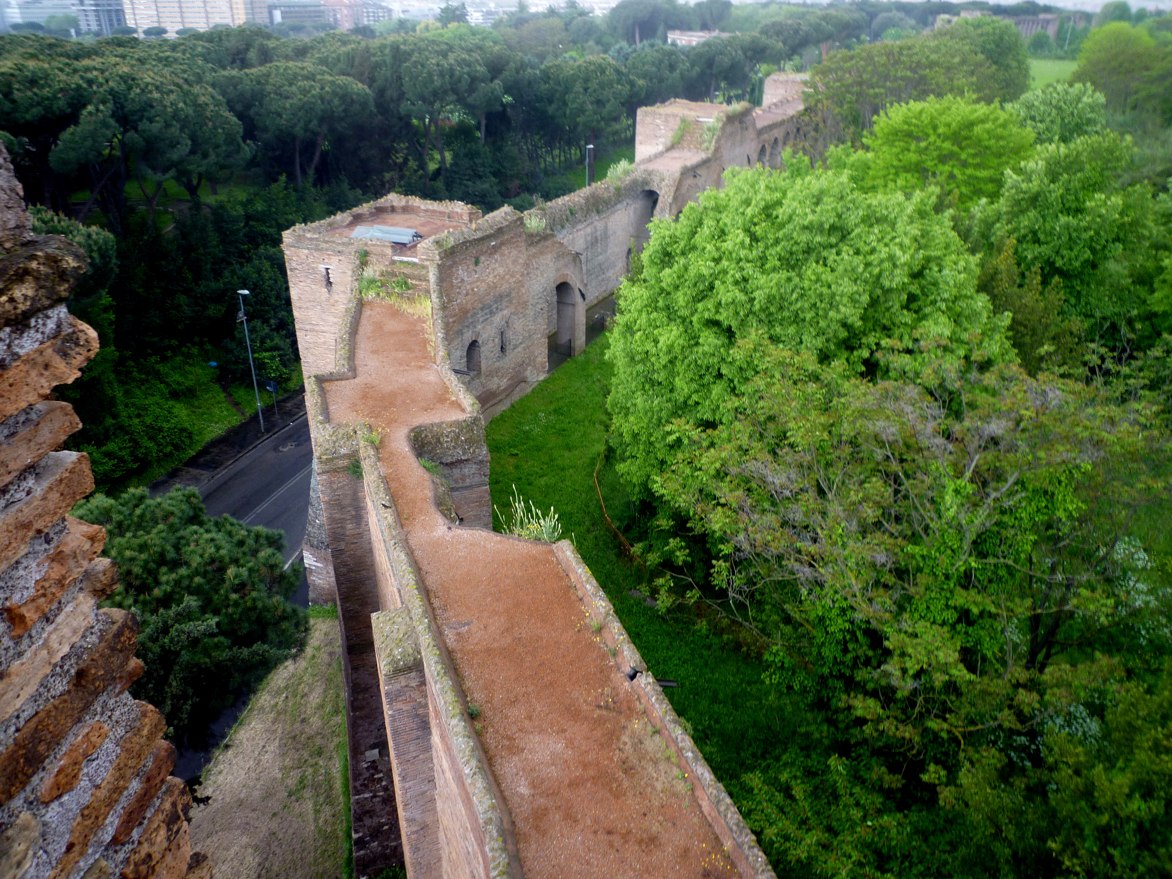 Tra il 270 ed il 275 d.C. l'imperatore Aureliano decise di far costruire una cinta muraria che si adattasse alle dimensioni accresciute della capitale dell’Impero per difenderla dalle invasioni barbariche. Il tracciato delle mura si sviluppava per circa 19 km (oggi ne restano circa 12) con uno spessore di 3,50 metri e un’altezza di circa 6,50 metri. La costruzione teneva conto dei fattori ambientali e topografici, rispettando la presenza di edifici antichi (es. Anfiteatro Castrense). Dove le mura incrociavano strade, vennero aperte porte di ingresso alla città caratterizzate da torri quadrate. Nel V secolo l’imperatore Onorio rinforzò l’intera struttura e la fece rialzare in molti punti.