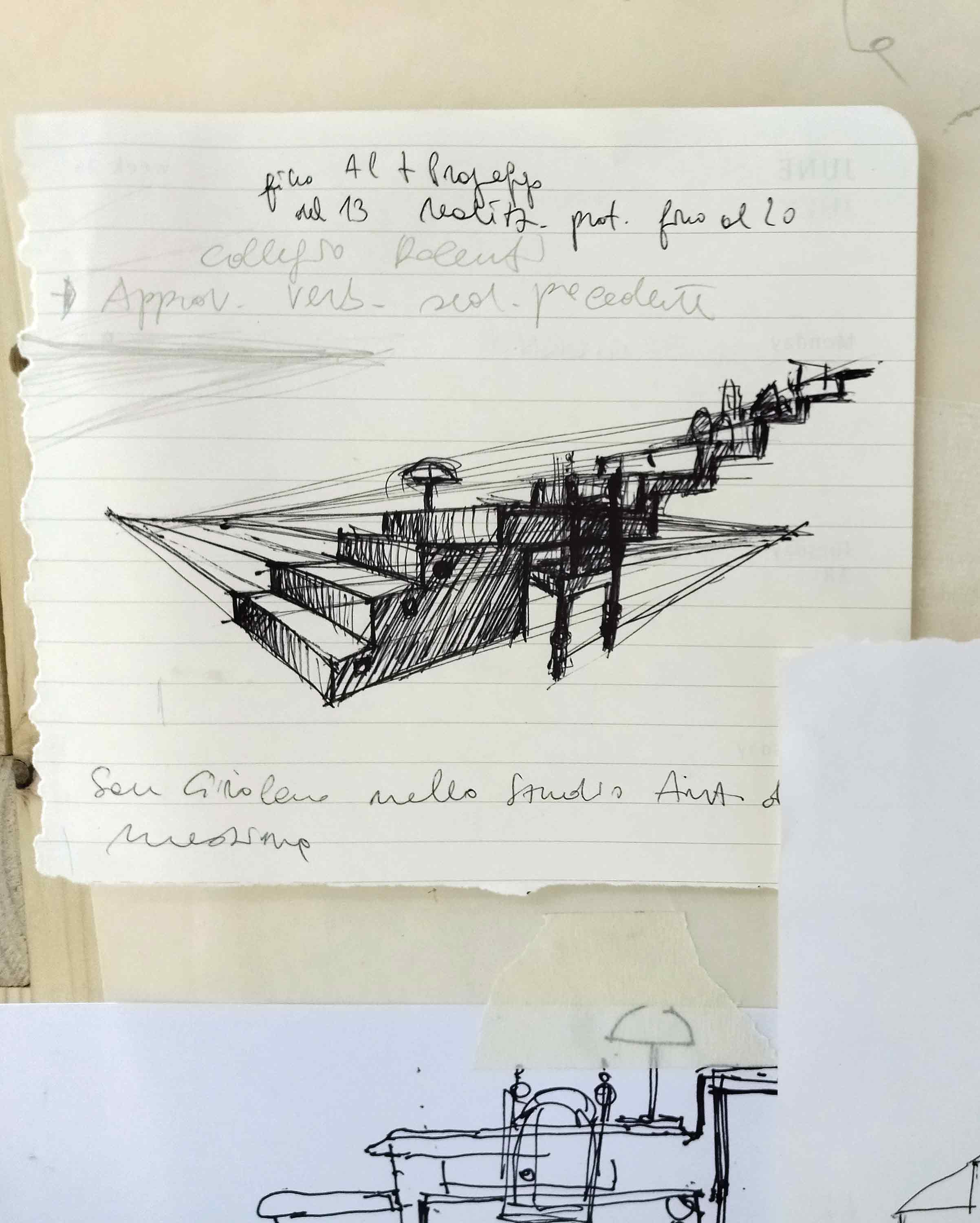 Analogamente prendono forma spunti letterari, come il racconto distopico La biblioteca di Babele di Jorge Luis Borges, dove la biblioteca viene descritta come un luogo infinito in cui eterni “viaggiatori” vagano nel tempo e nello spazio “alla ricerca di un libro, del catalogo dei cataloghi” e parlano di “scale senza gradino, dove per poco non si ammazzano”, di speranza e scoramento, di contraddizioni infinite. Un altro riferimento è Merzbau di Kurt Shwizzer in cui luogo, architettura e scultura si fondono prendendo la forma dello studio temporaneo dell’artista orientato in verticale, dove il frammento si fa segno, appunto, intuizione.