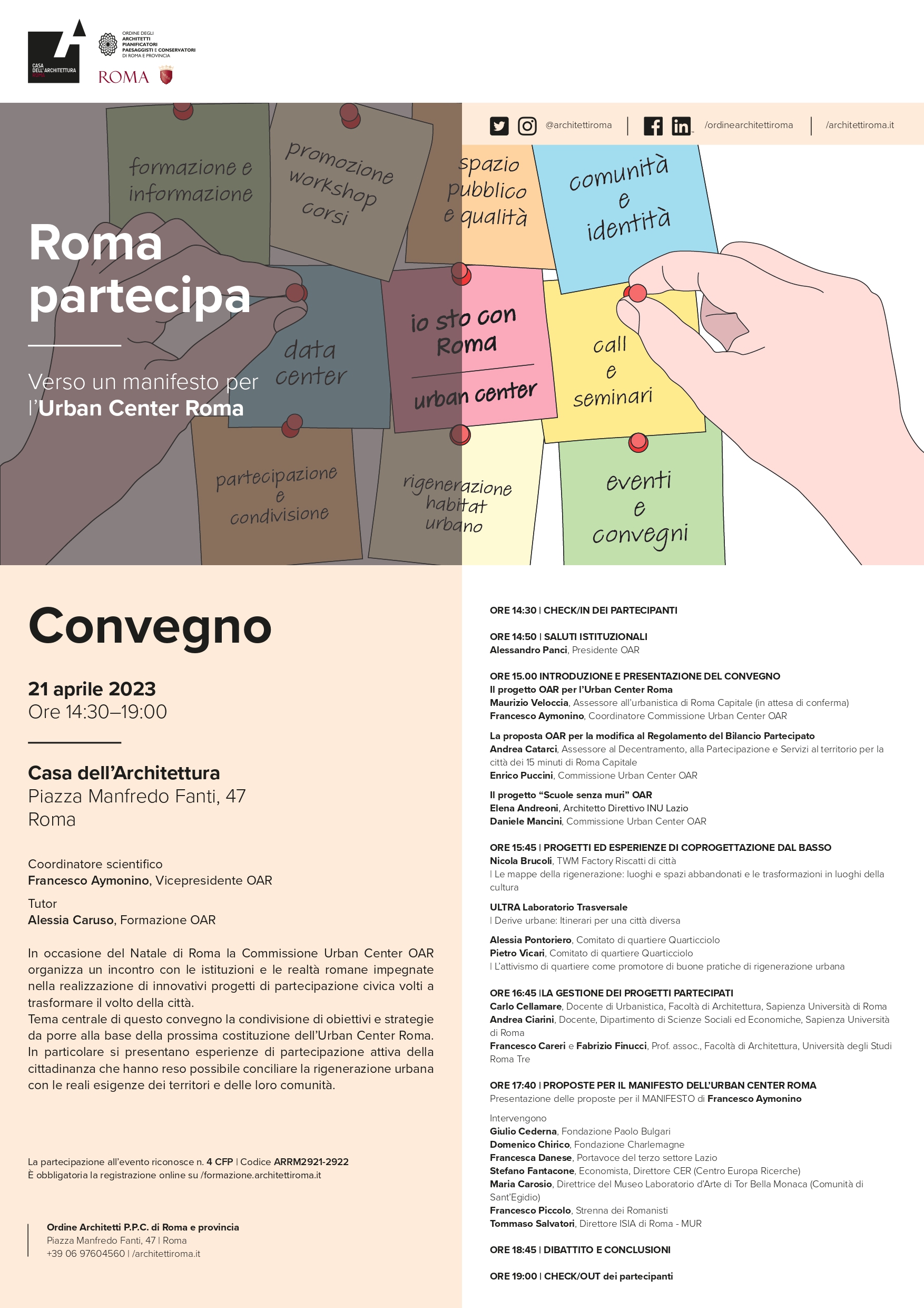 Tema centrale di questo convegno la condivisione di obiettivi e strategie da porre alla base della prossima costituzione dell'Urban Center Roma. In particolare si presentano esperienze di partecipazione attiva della cittadinanza che hanno reso possibile conciliare la rigenerazione urbana con le reali esigenze dei territori e delle loro comunità.