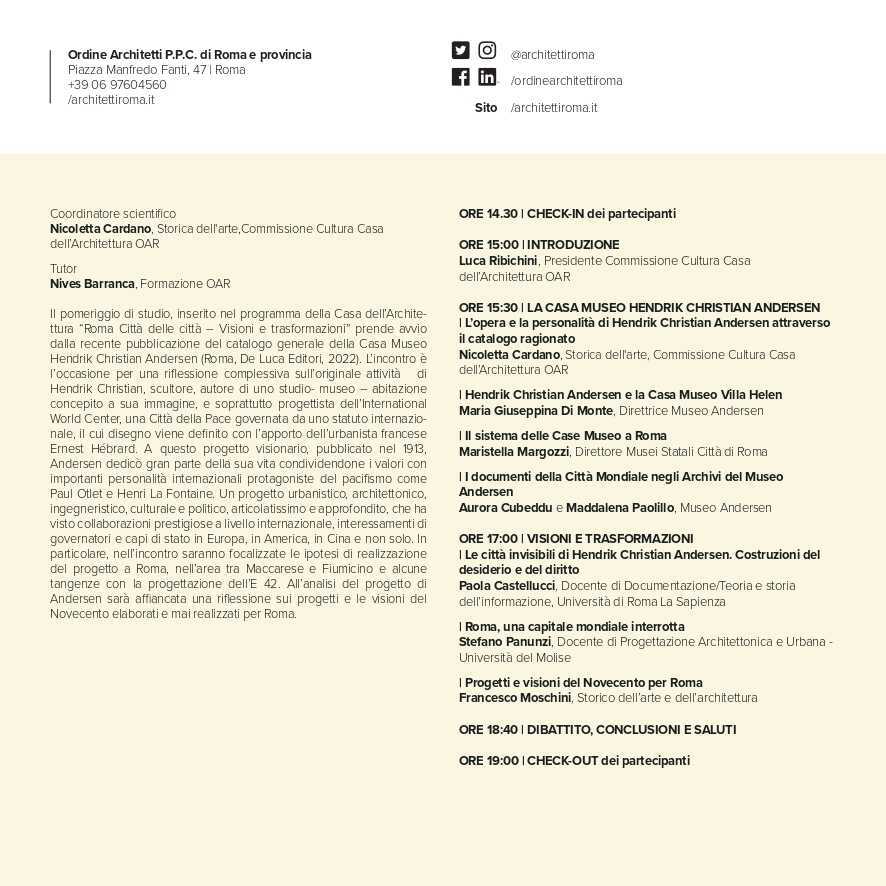 Il pomeriggio di studio, inserito nel programma della Casa dell'Architettura "Roma Città delle città - Visioni e trasformazioni" prende avio dalla recente pubblicazione del catalogo generale della Casa Museo Hendrik Christian Andersen (Roma, De Luca Editori 2022). L'incontro è l'occasione per una riflessione complessiva sull'originale attività Hendrik Christian, scultore, autore di uno studio- museo - abitazione concepito a sua immagine, e soprattutto progettista dell'International World Center, una Città della Pace governata da uno statuto internazio- nale, il cui disegno viene definito con l'apporto dell'urbanista francese Ernest Hébrard. A questo progetto visionario, pubblicato nel 1913, Andersen dedicò gran parte della sua vita condividendone i valori con importanti personalità intemazionali protagoniste del pacifismo come Paul Ctlet e Henri La Fontaine. Un progetto urbanistico, architettonico, Ingegneristico, culturale e politico, articolatissimo e approfondito, che ha visto collaborazioni prestigiose a livello internazionale, interessamenti di governatori e capi di stato in Europa, in America, in Cina e non solo. In particolare, nell'incontro saranno focalizzate le ipotesi di realizzazione del progetto a Roma, nell'area tra Maccarese e Fiumicino e alcune tangenze con la progettazione dell'E 42. All'analisi del progetto di Andersen sarà affiancata una riflessione sui progetti e le visioni del Novecento elaborati e mai realizzati per Roma.