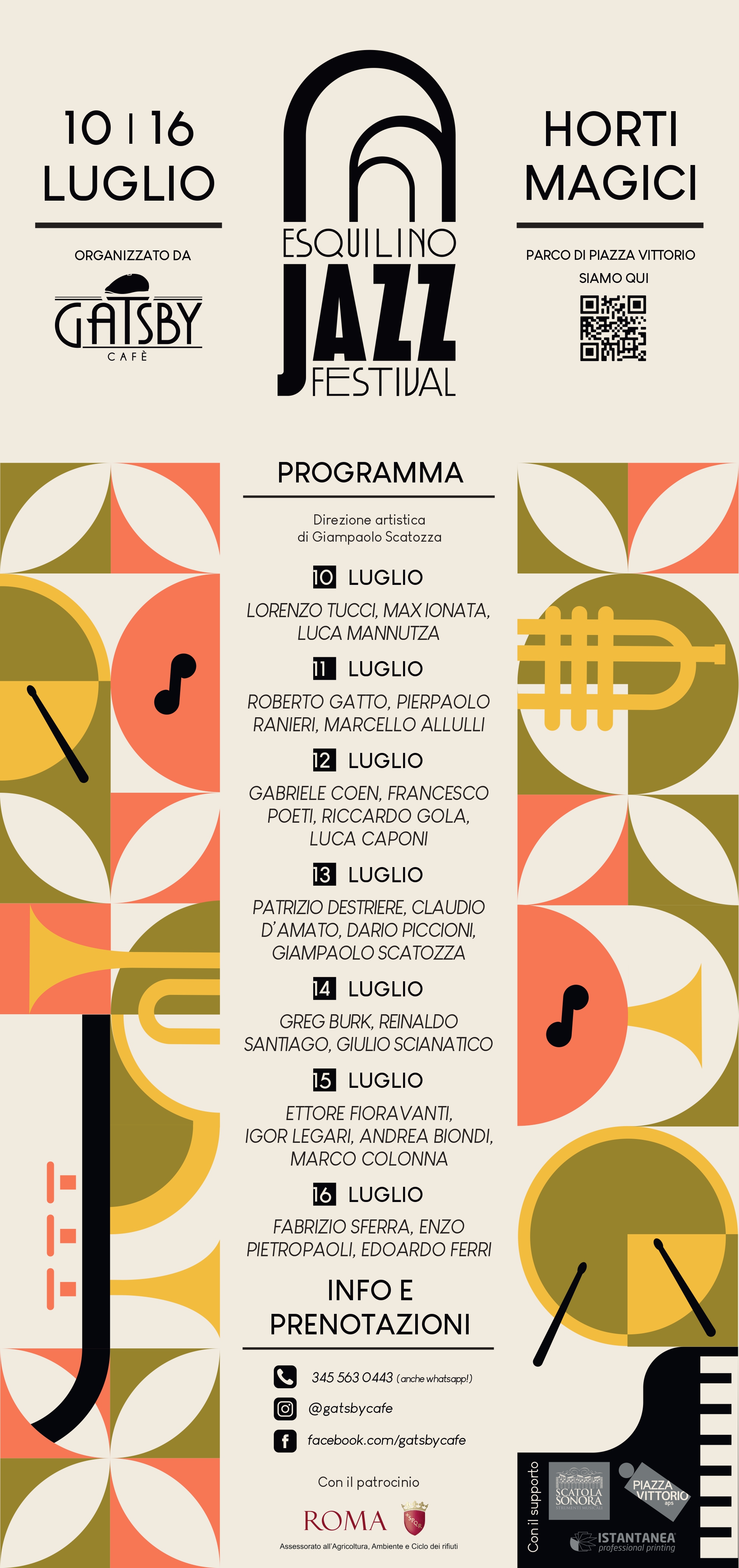Immersi nella location splendida e vibrante dei Giardini di Piazza Vittorio gli ospiti di Horti Magici assisteranno a 7 sere in cui il jazz sarà l'assoluto protagonista con un programma ricco e variegato accompagnato dall'offerta food & beverage a firma Gatsby, diventato in 6 anni un marchio riconosciuto e apprezzato nel panorama delle serate romane.