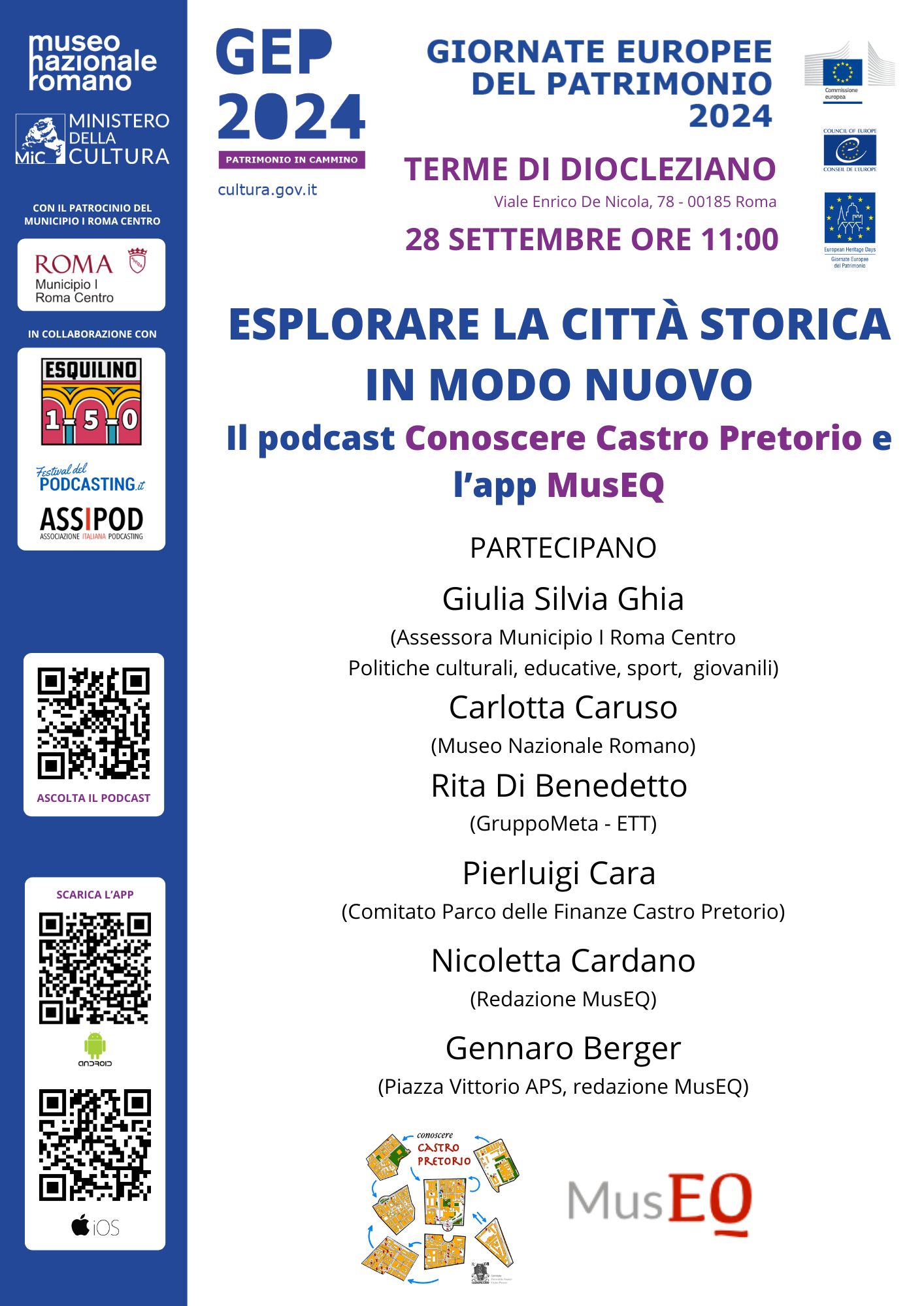 Di particolare interesse l’evento “Esplorare la città storica in modo nuovo: Il podcast Conoscere Castro Pretorio e l’app MusEQ” che si terrà alle ore 11:00 all’interno della suggestiva cornice delle Terme di Diocleziano. Verrà presentata l’iniziativa futura di integrare lo strumento digitale di fruizione MusEQ con i contenuti raccontati nel podcast “Conoscere Castro Pretorio” e che coinvolgono il territorio del Rione Castro Pretorio, un tempo unito all’Esquilino.
