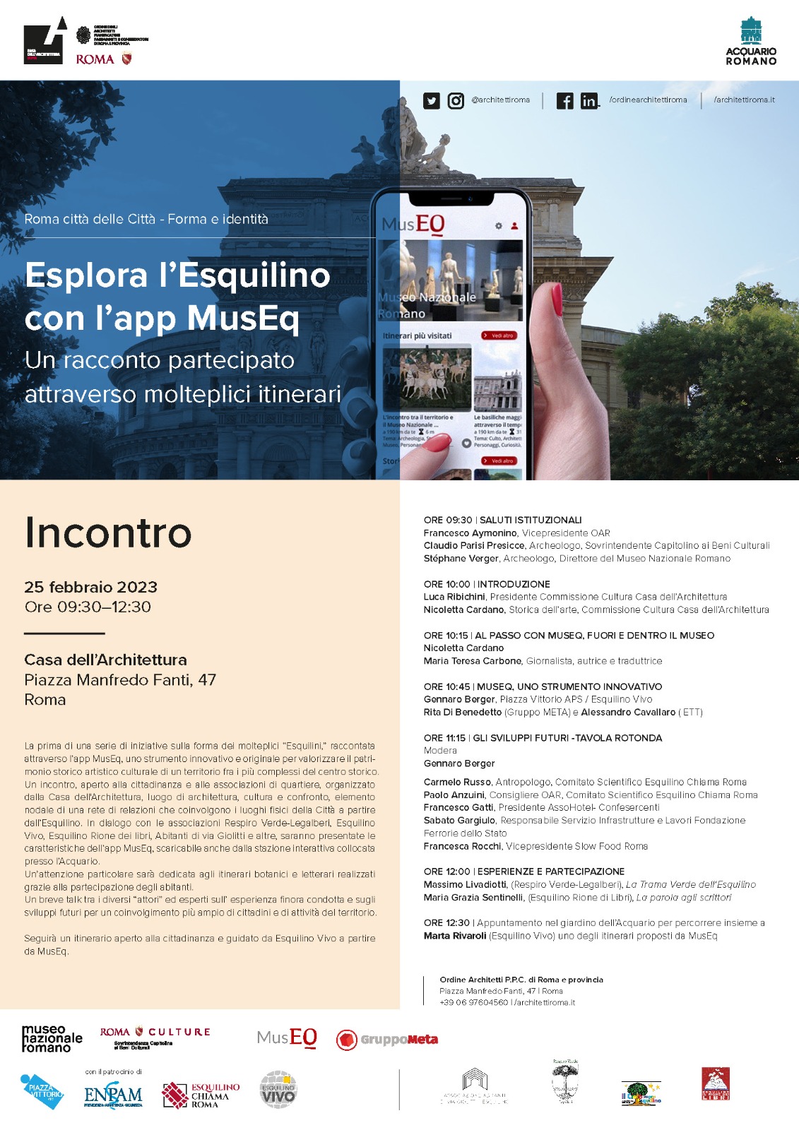 Dopo i saluti istituzionali di Francesco Aymonino, Vicepresidente Ordine degli Architetti di Roma, Lorenza Bonaccorsi, Presidente Municipio I, Claudio Parisi Presicce, archeologo, Sovrintendente Capitolino ai Beni Culturali e Stéphane Verger, archeologo, Direttore del Museo Nazionale Romano, Luca Ribichini, Presidente Commissione Cultura Casa dell’Architettura e Nicoletta Cardano, storica dell’arte, Commissione Cultura Casa dell’Architettura, introdurranno gli approfondimenti su MusEQ, affidati a Maria Teresa Carbone, giornalista, autrice e traduttrice, con Nicoletta Cardano, Gennaro Berger (Piazza Vittorio APS / Esquilino Vivo), Rita Di Benedetto (GruppoMeta) e Alessandro Cavallaro (ETT).