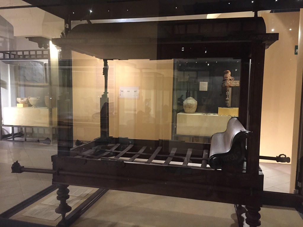 Fu Augusto Castellani, uno dei più grandi orafi antiquari della seconda metà del XIX secolo, a ricomporre insieme i pezzi che ricostruiscono una elegante lettiga in bronzo. Si tratta in effetti di una ricostruzione immaginaria, un pastiche in cui sono assemblati frammenti di provenienza diversa ritrovati nella zona di Termini nel 1874. A costituire questo oggetto speciale sono in realtà i frammenti di un letto da triclinio, di un carro e di una cassa, secondo una prassi restitutiva e interpretativa frequente nell’Ottocento.