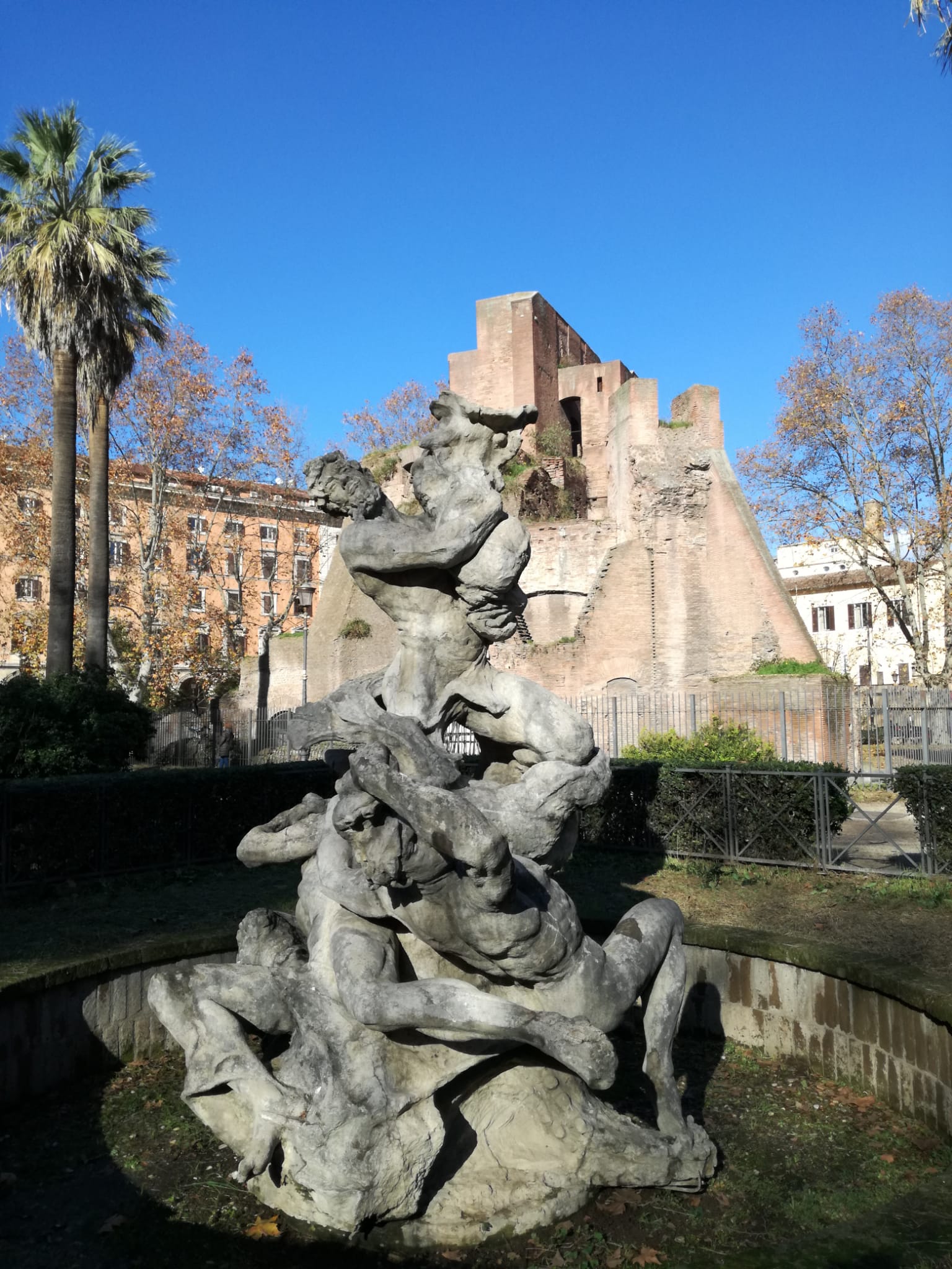 Il gruppo scultoreo che rappresenta 3 tritoni, un delfino e un grosso polpo intrecciati tra loro, viene realizzato nel 1911 dallo scultore palermitano Mario Rutelli a completamento della fontana delle Najadi, collocata nell’attuale Piazza della Repubblica.