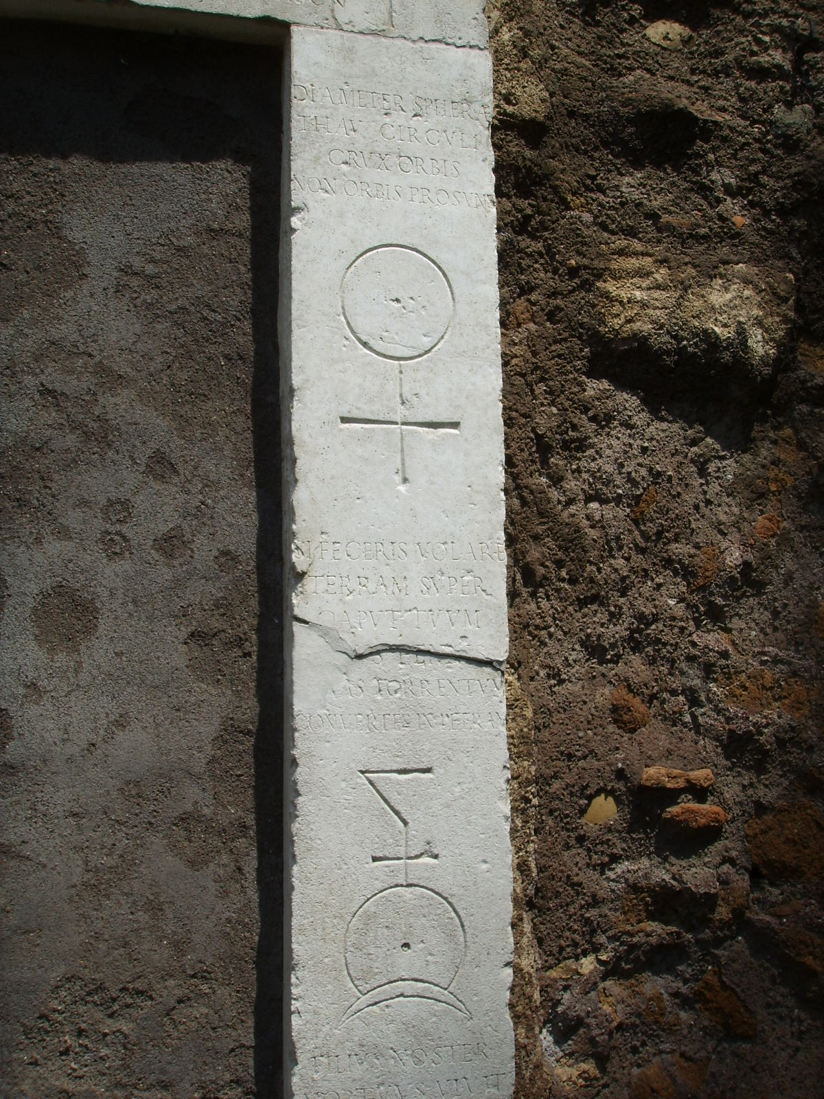 Del monumento, frammento unico della cultura esoterica romana del XVII secolo, restano la cornice in pietra calcarea con incisi simboli e iscrizioni, e il tondo in marmo che la sovrasta, allusivo alla Trinità Divina, con rilievi interni che rappresentano due triangoli equilateri con i vertici opposti, un cerchio e una croce.