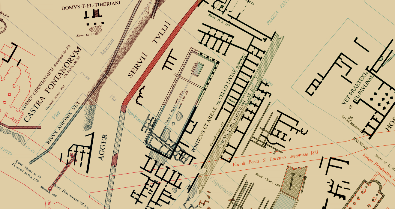 La zona urbana dentro e fuori della Porta Esquilina (oggi Arco di Gallieno), era uno dei centri della vita pubblica della Roma imperiale e comprendeva il Forum Esquilinum e il Macellum Liviae, il mercato di carni voluto dall’Imperatore Augusto e dedicato a sua moglie Livia. Nelle vicinanze, in un’area non ben precisata, era collocato il Lacus Orphei, una grandiosa mostra d’acqua con la statua di Orfeo. Di fatto la distribuzione degli edifici nella zona è ancora oggetto di discussione tra gli storici, tuttavia appena fuori dalla porta Esquilina, a nord della strada, sono stati trovati dei resti che potrebbero ben corrispondere a quelli del Macellum Liviae. Si è rinvenuto un cortile aperto di ampie dimensioni, realizzato in opus reticulatum e disposto parallelamente alle mura serviane, presumibilmente circondato da un portico con botteghe. Dal principio del III secolo d.C. sembra che la parte meridionale di quest'area fosse invasa dalla costruzione di edifici privati.
