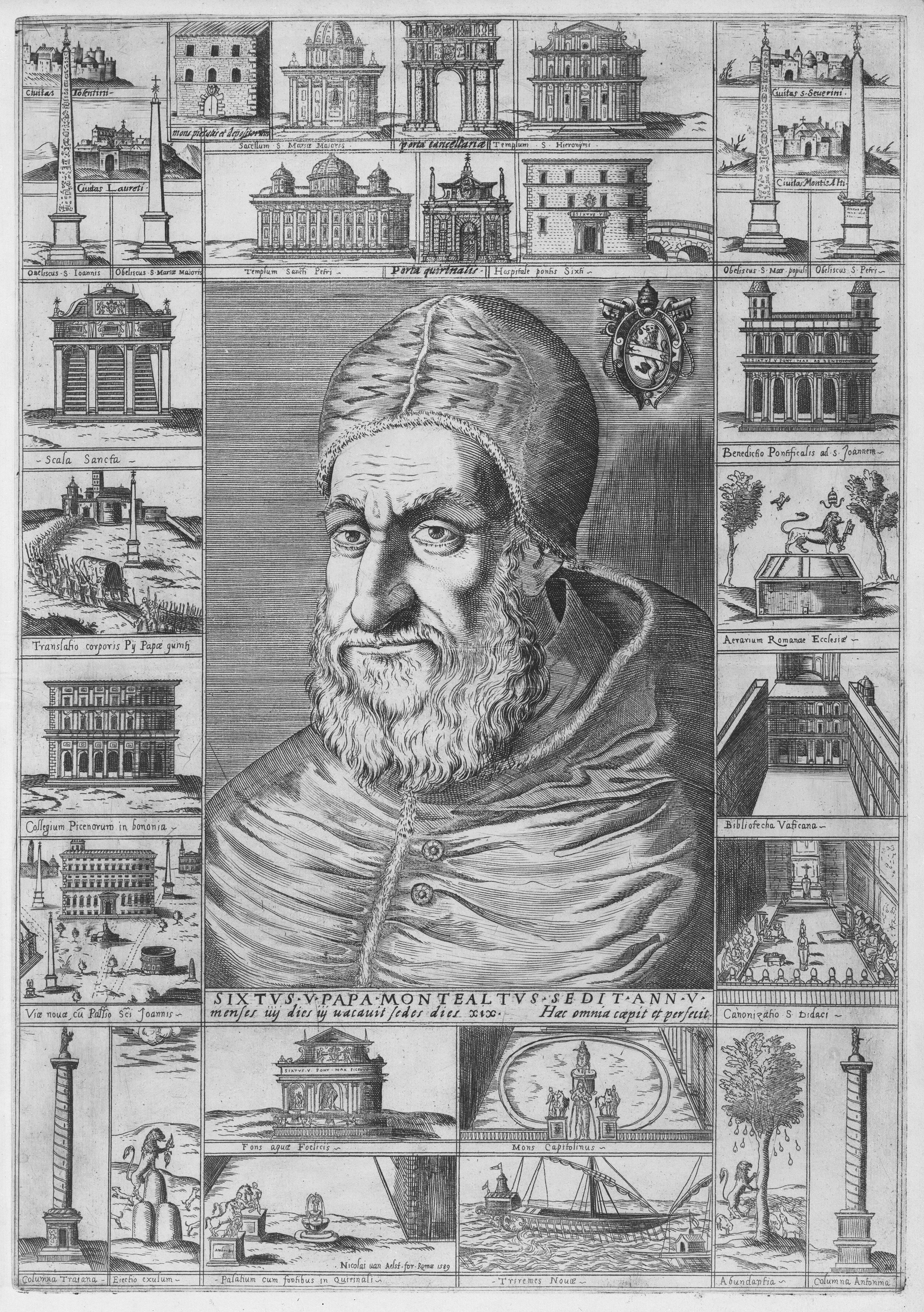 Grande riformatore della struttura ecclesiastica in senso assolutista e grande promotore delle arti, il francescano Felice Peretti salito al soglio pontificio con il nome di Sisto V lascia un segno indelebile nella struttura urbanistica di Roma. In soli cinque anni di regno (1585-1590) questo pontefice dal carattere di ferro riprende in maniera innovativa i progetti stradali proposti dai suoi predecessori e ordina il tracciato di grandi assi rettilinei che collegano le basiliche principali di Roma. Grazie all’architetto Domenico Fontana, fedele esecutore dei suoi piani, crea una città multicentrica e facilmente percorribile. I due poli di questo sistema sono la basilica di San Pietro in Vaticano che porta a termine con il completamento della cupola e Santa Maria Maggiore.